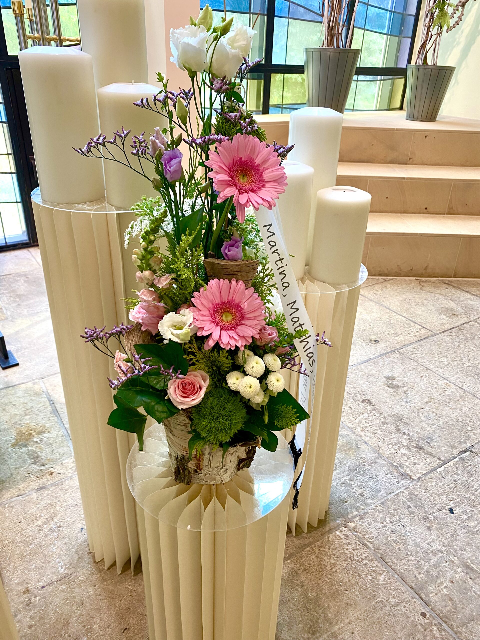 Rosa Rosen stehen im Mittelpunkt des Gestecks und symbolisieren Liebe, Dankbarkeit und die tiefe Verbundenheit zum Verstorbenen.