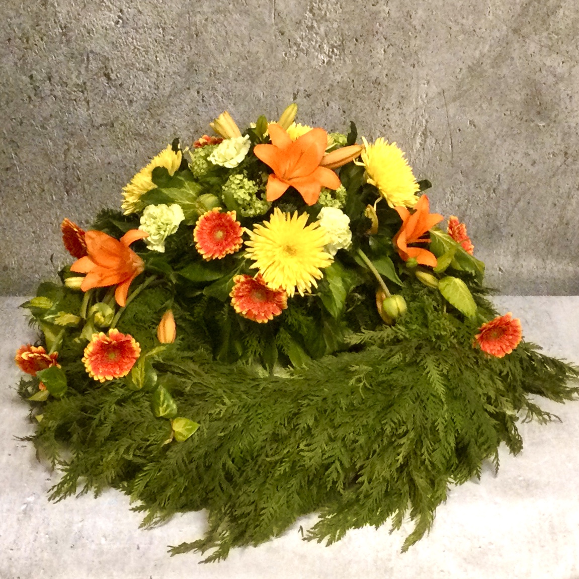 Die Kombination aus Blüten und Grün vermittelt Trost und Zuversicht und eignet sich besonders für einen positiven, dankbaren Abschied.