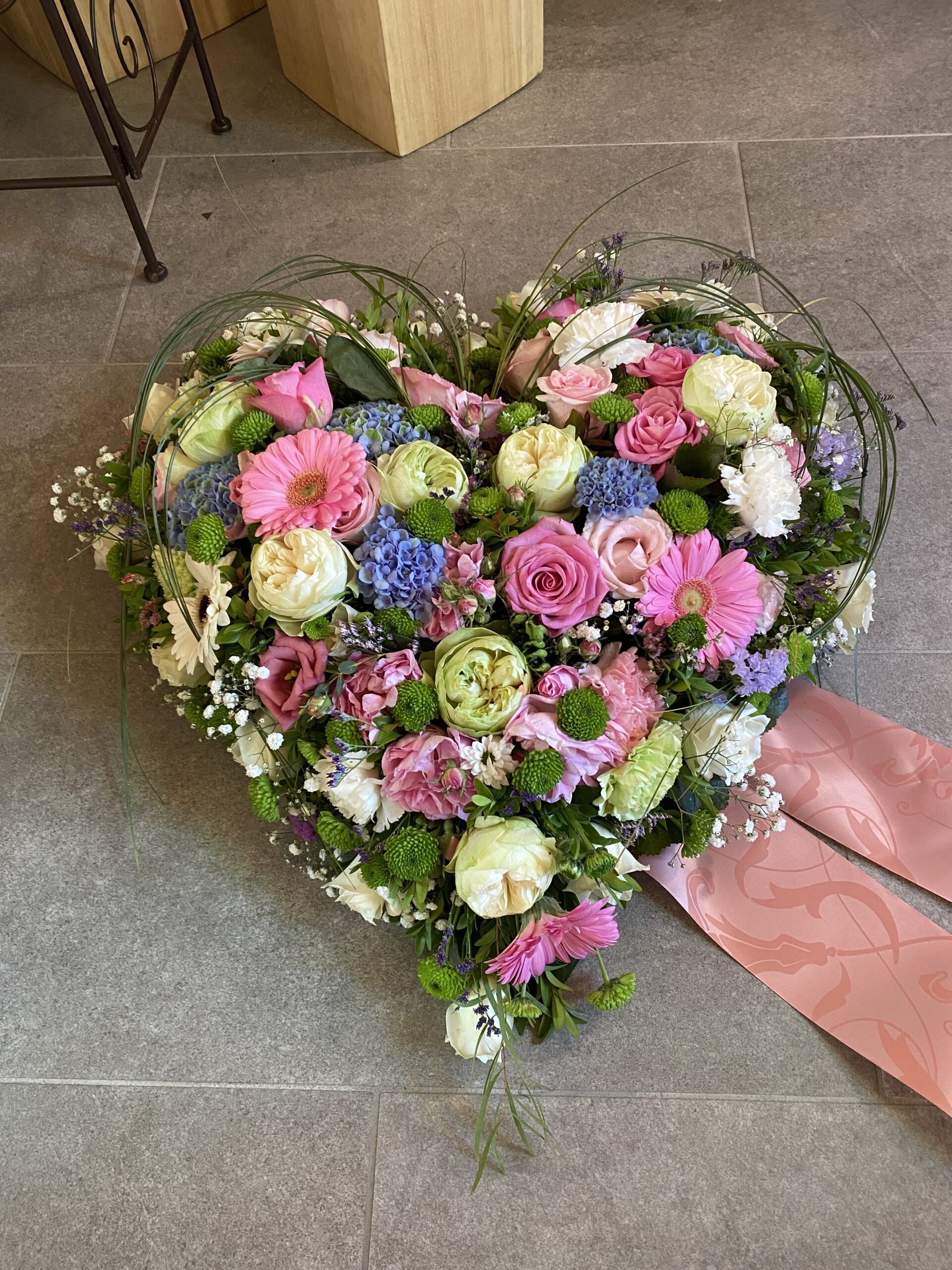 Dieses rosafarbene Trauerherzgesteck aus frischen Gerbera, Rosen und zartem Grün formt ein herzliches Symbol der Liebe und des Abschieds – ideal für Beerdigungen und Trauerfeiern. Die sanfte rosa Farbe symbolisiert Zärtlichkeit, Hoffnung und innige Verbundenheit und verleiht der Zeremonie tröstliche Wärme.